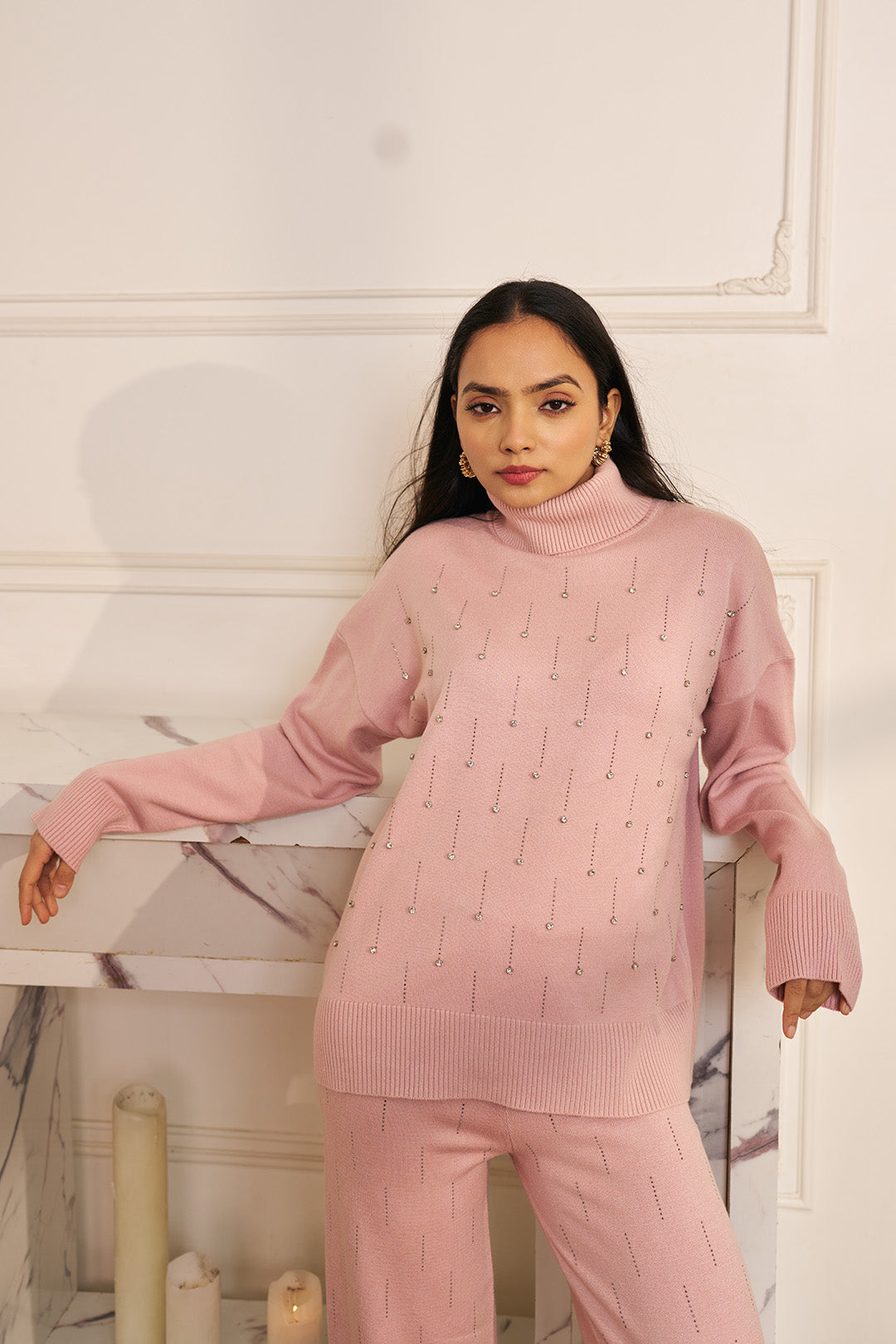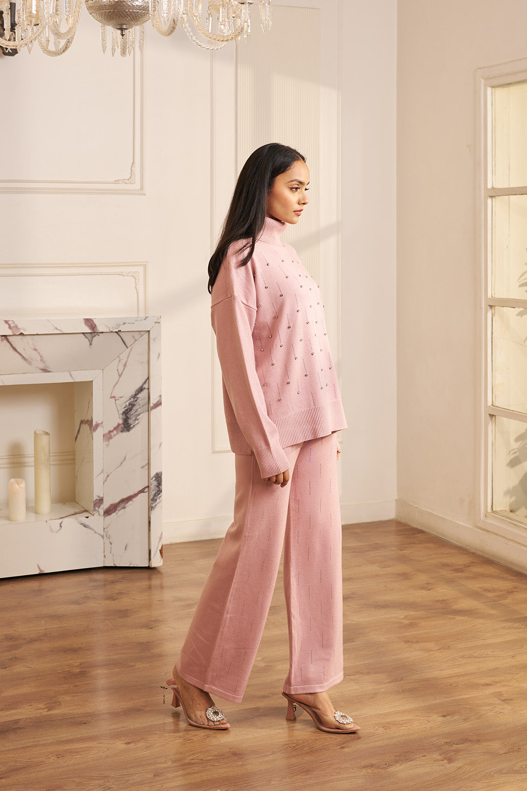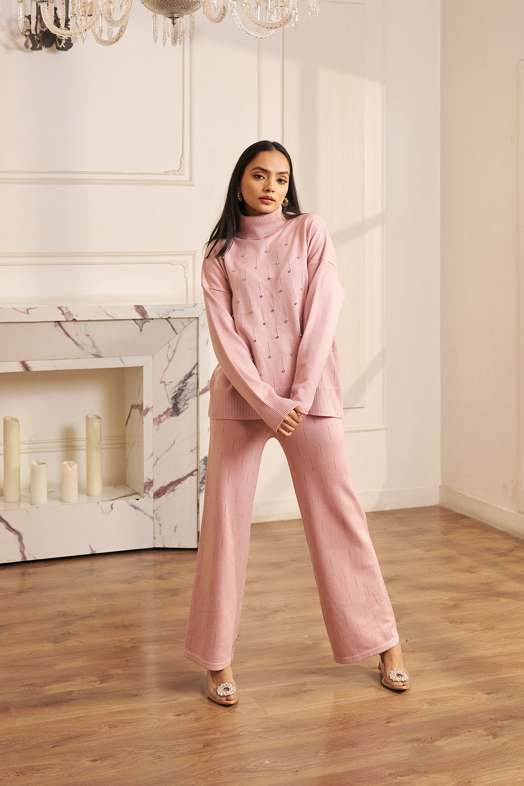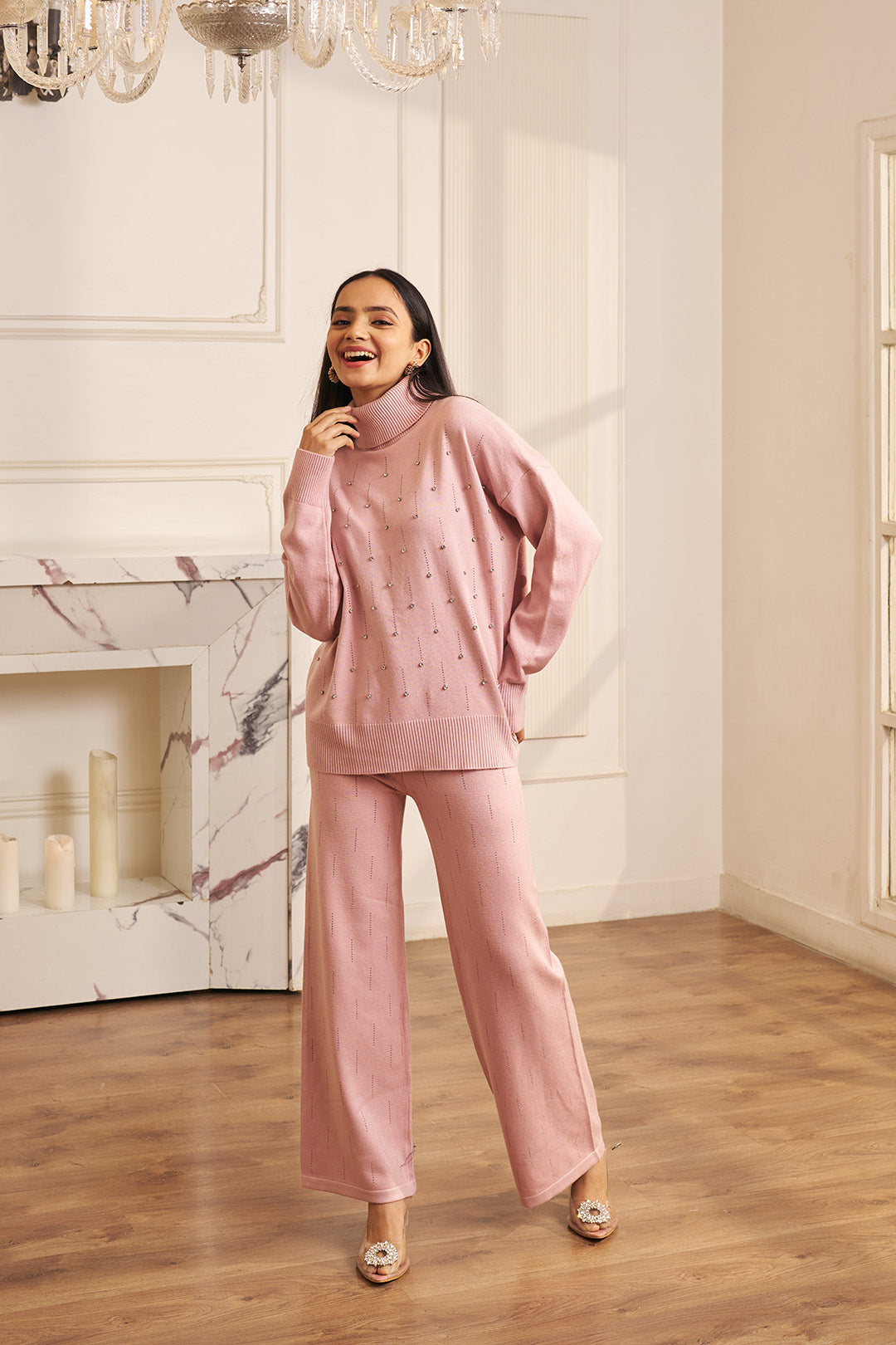 Women Soft Pink Knit Embellished Co-ord Set Janet