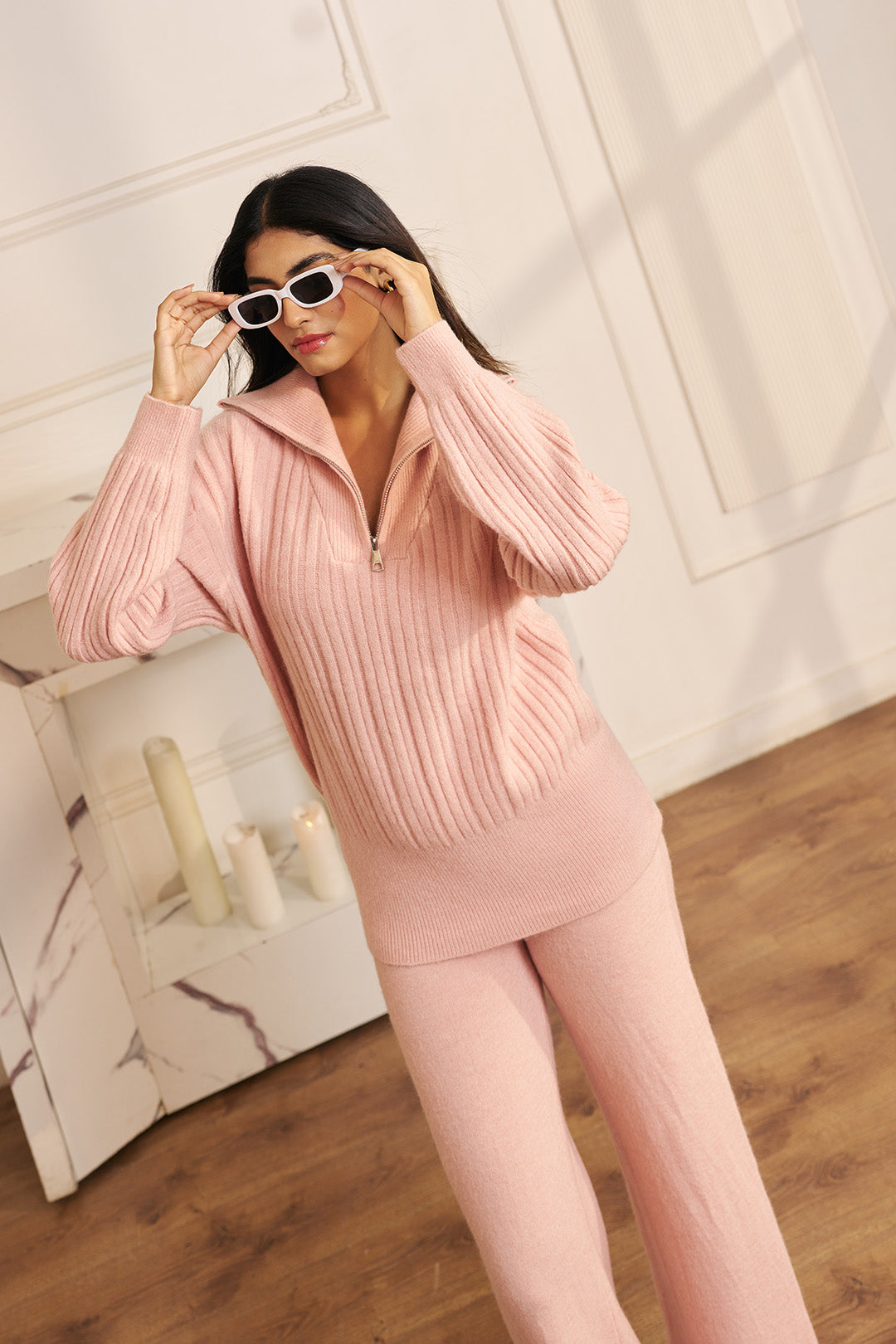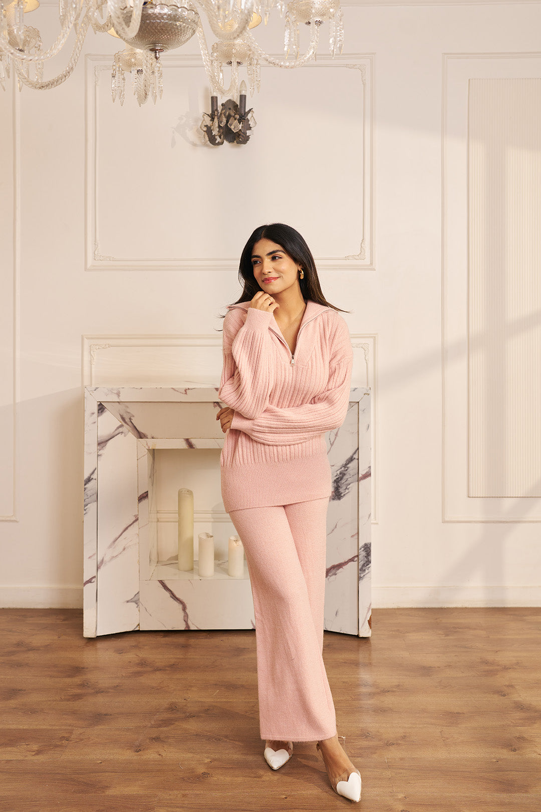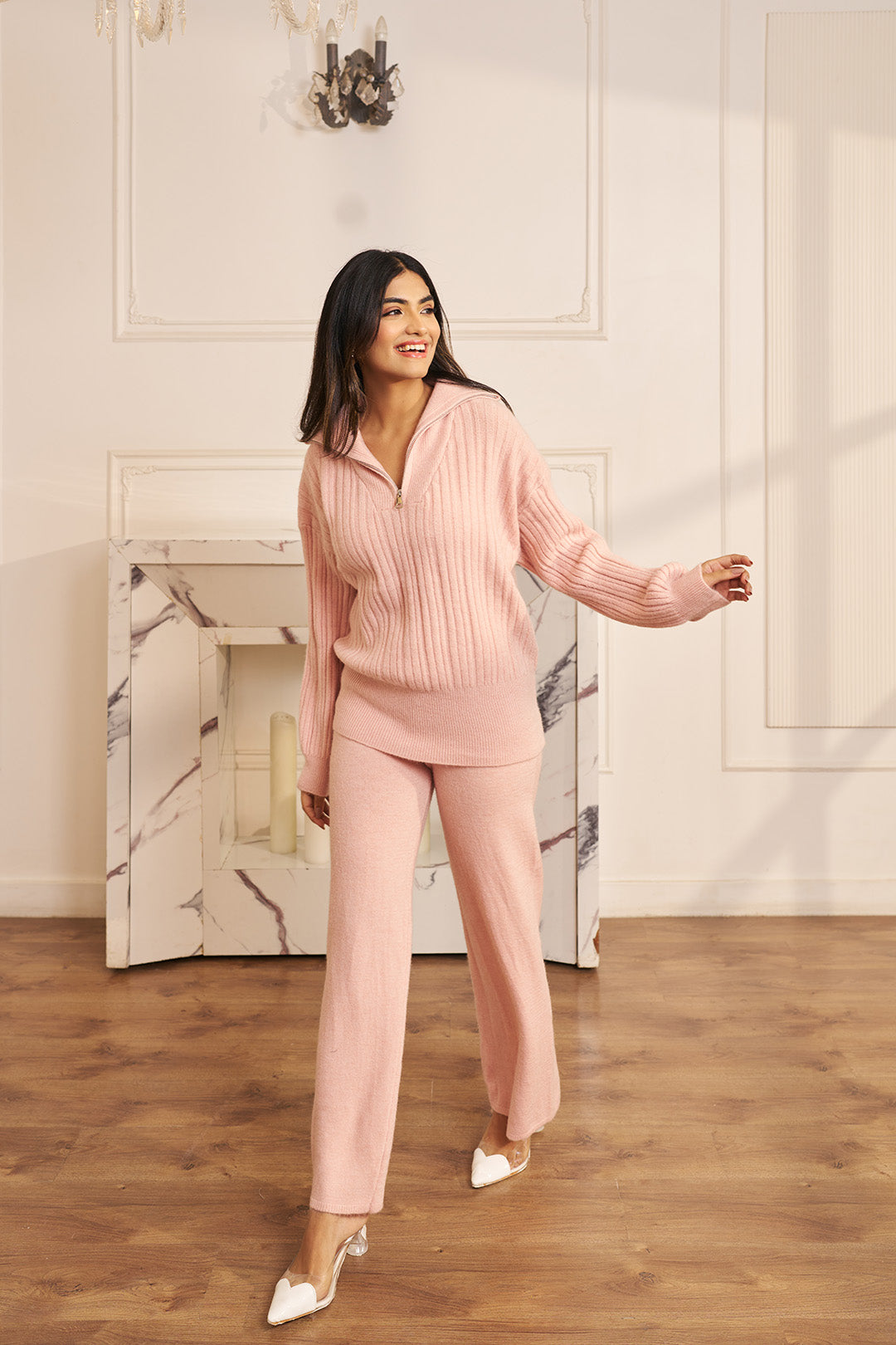 Women Light Pink High Neck With Quarter Zip Knit Co-ord Set Lizzy Pink