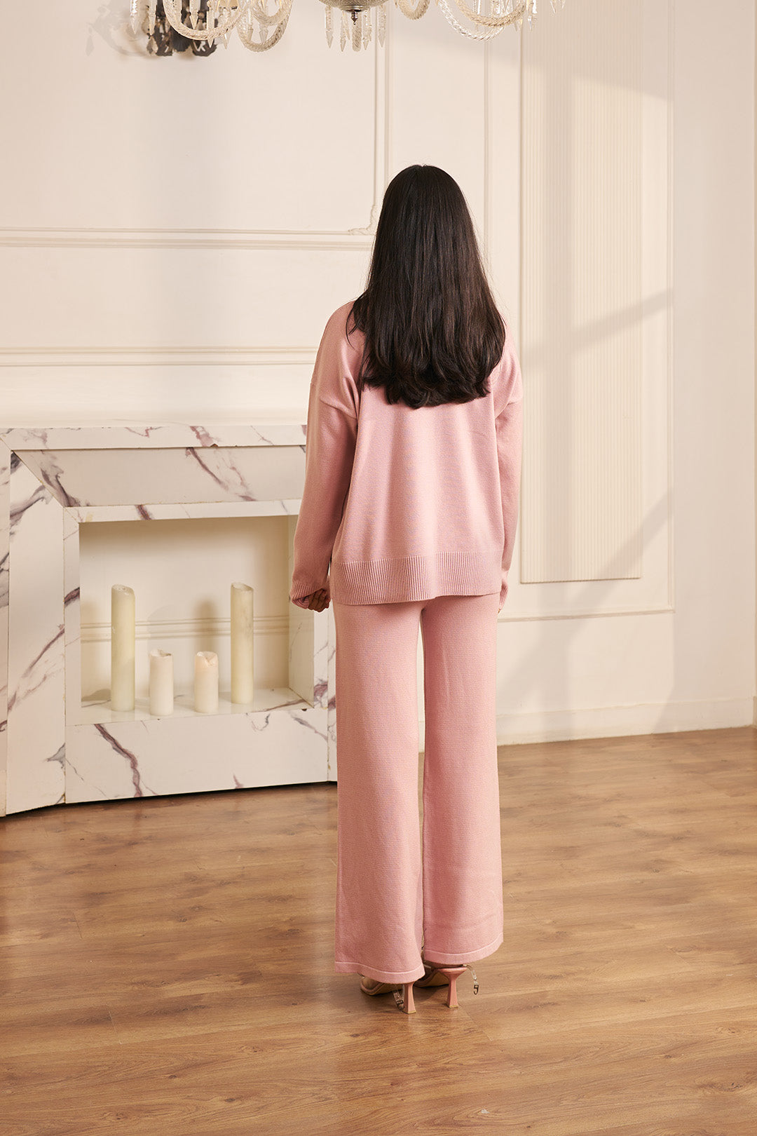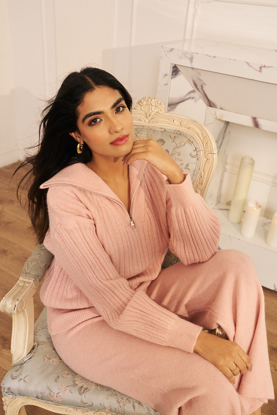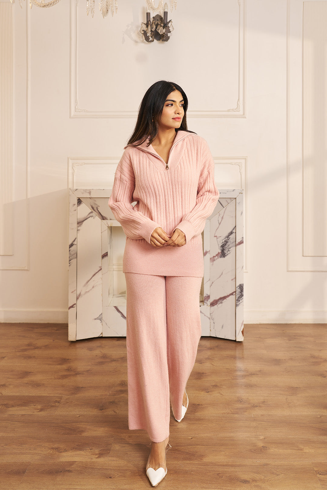 Women Light Pink High Neck With Quarter Zip Knit Co-ord Set Lizzy Pink