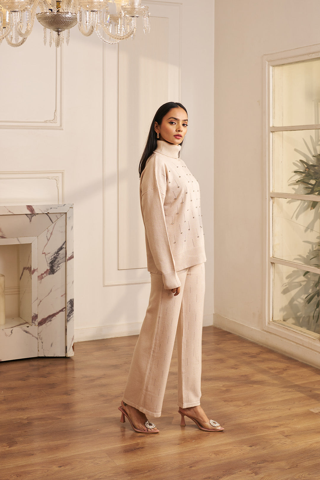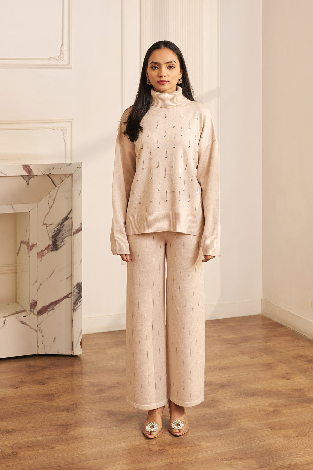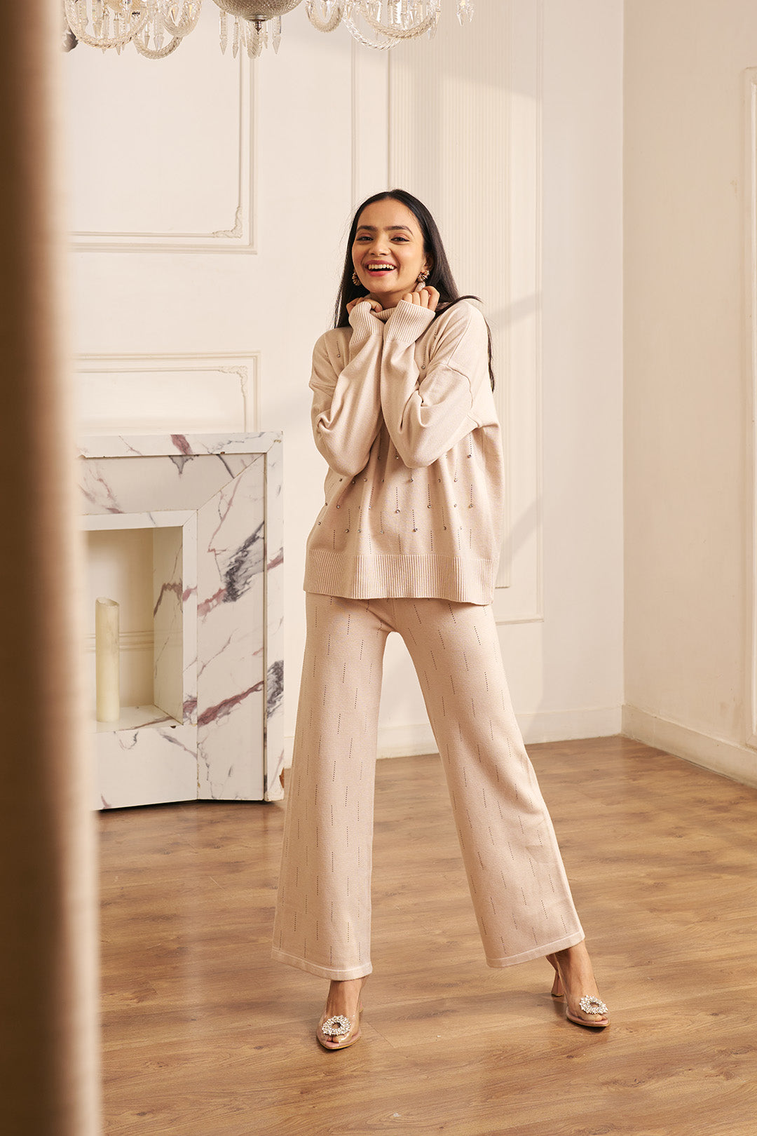 Women Beige Knit Embellished Co-ord Set Janet Beige