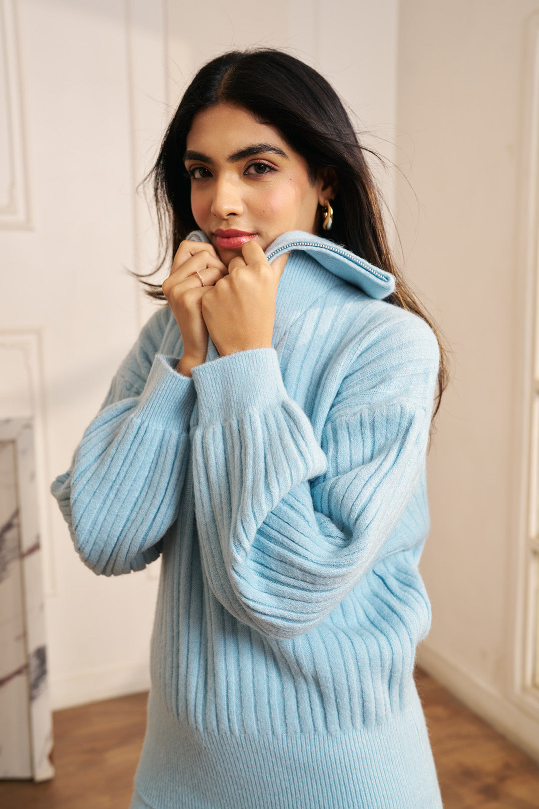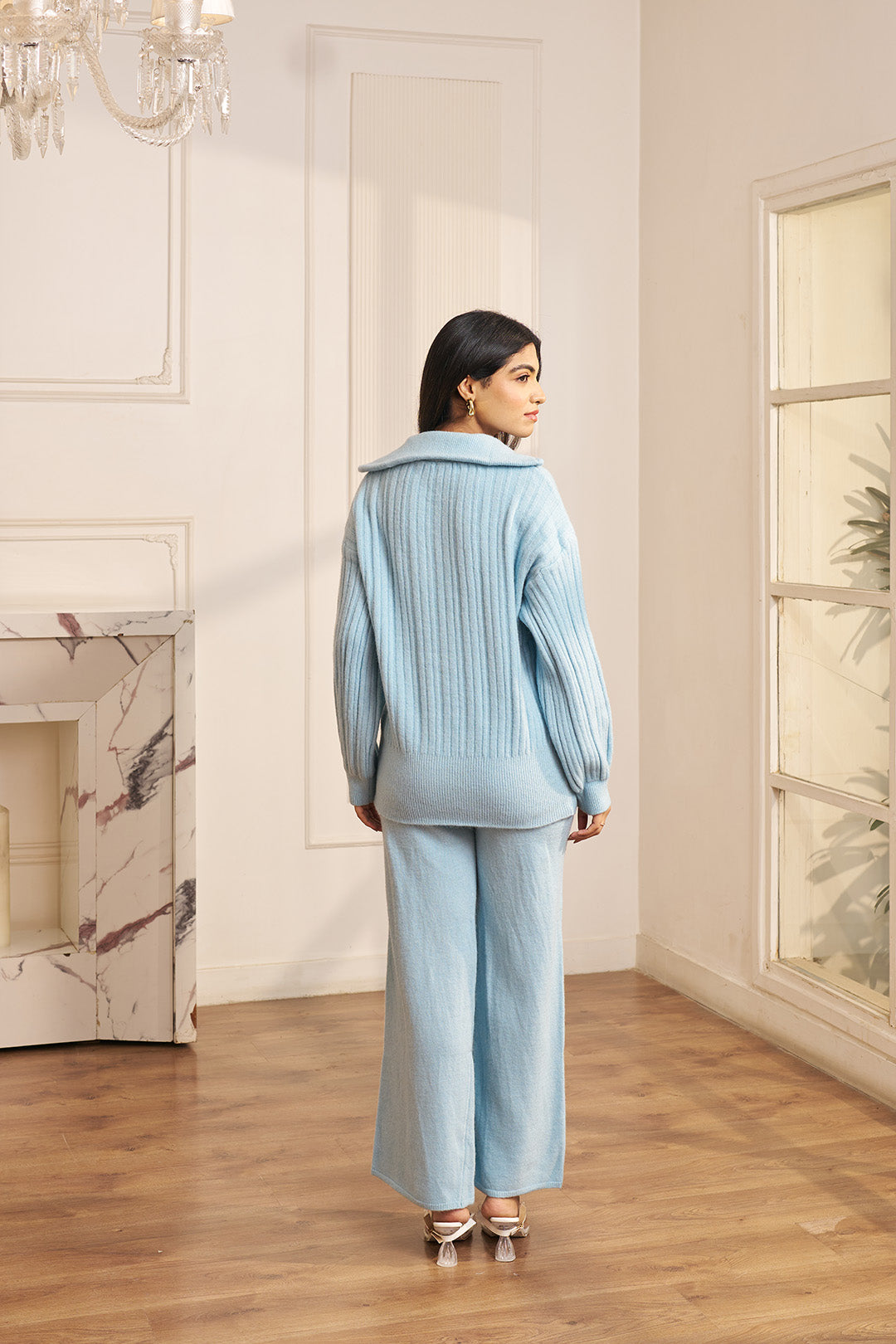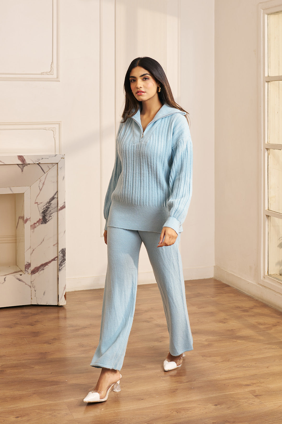 Women Light Pink High Neck With Quarter Zip Knit Co-ord Set Lizzy Ice Blue