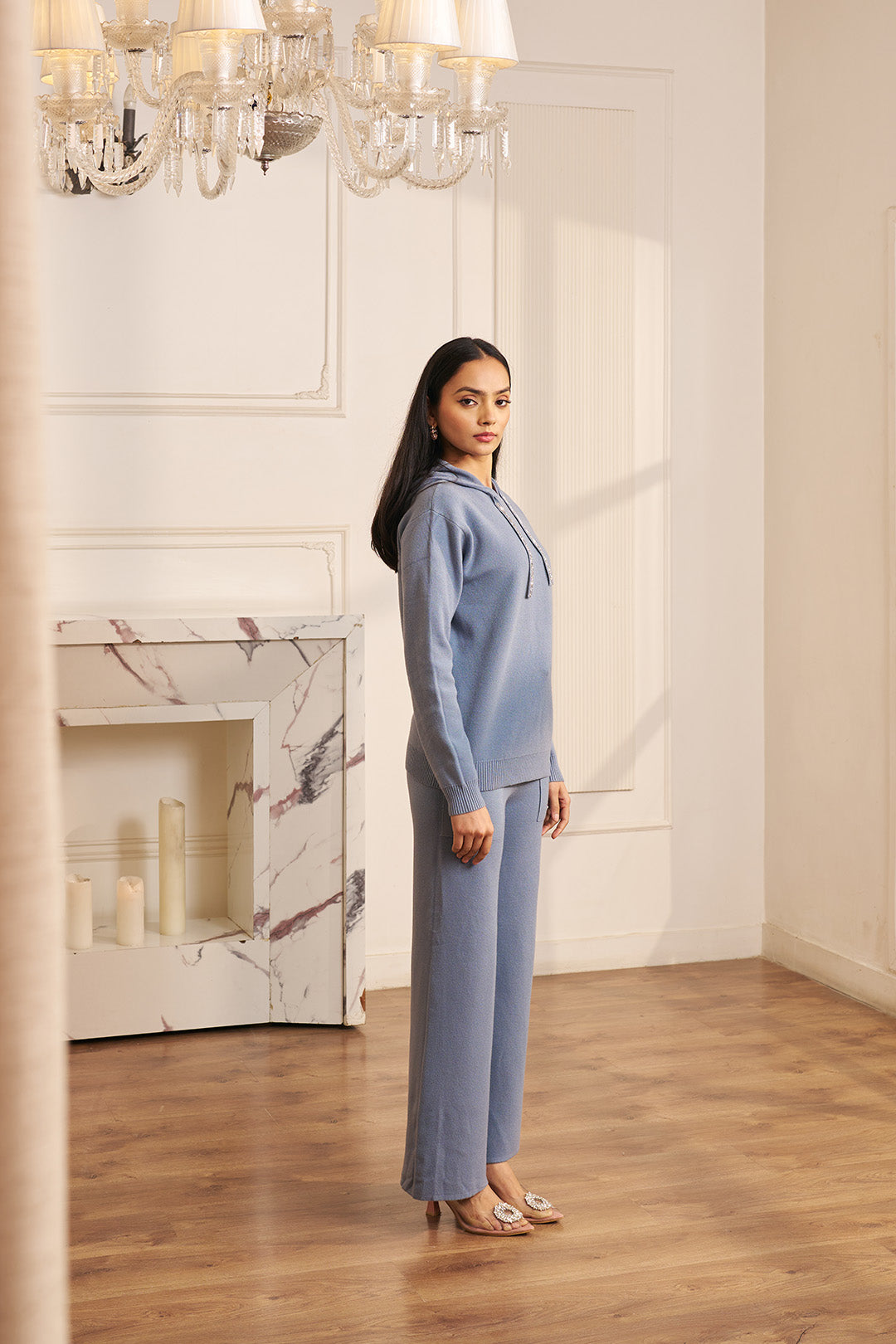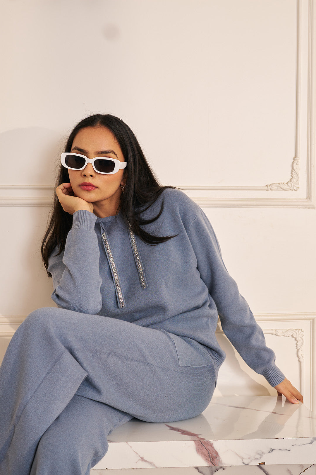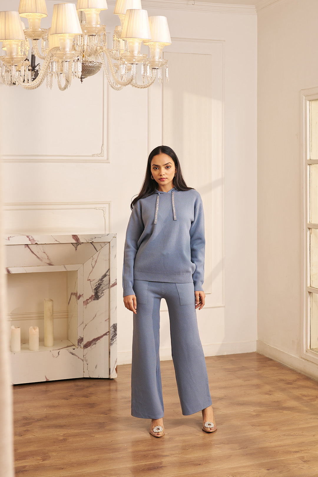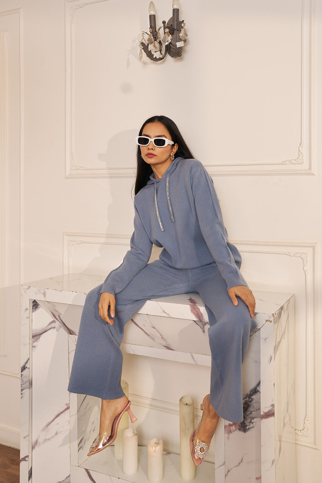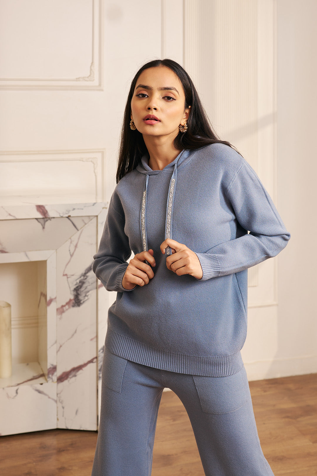 Women Lilac Knitted Hoodie Co-ord Set with Embellished Drawstring Mayson Blue