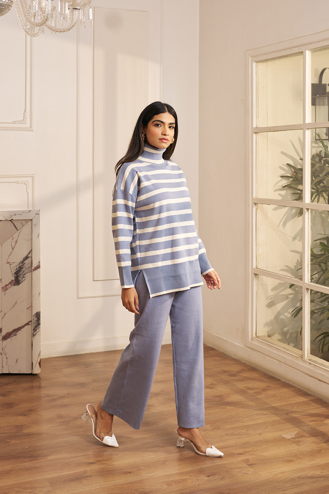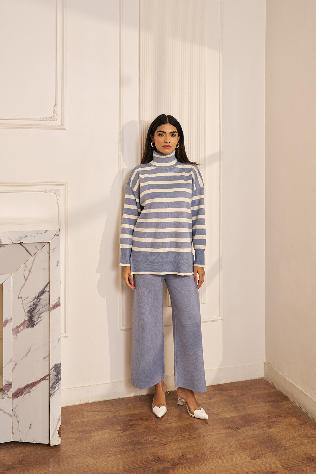 Women Blue and White Striped Turtle Neck Knit Co-ord Set Kourtney