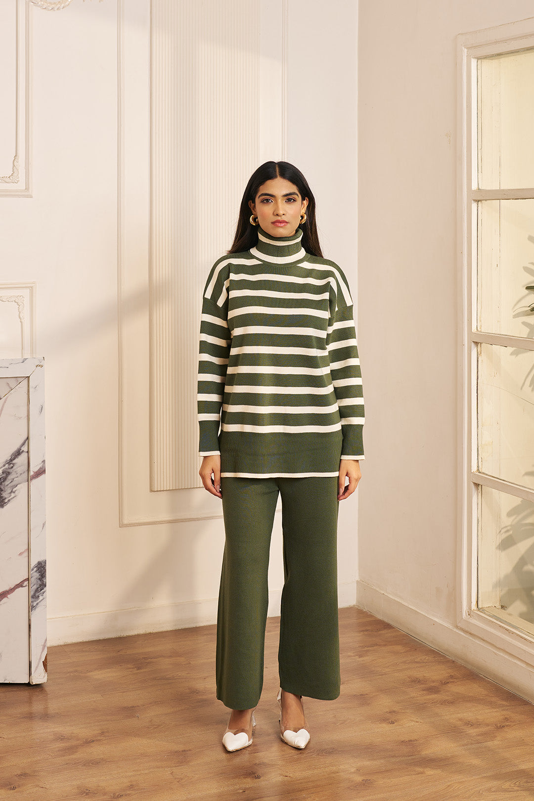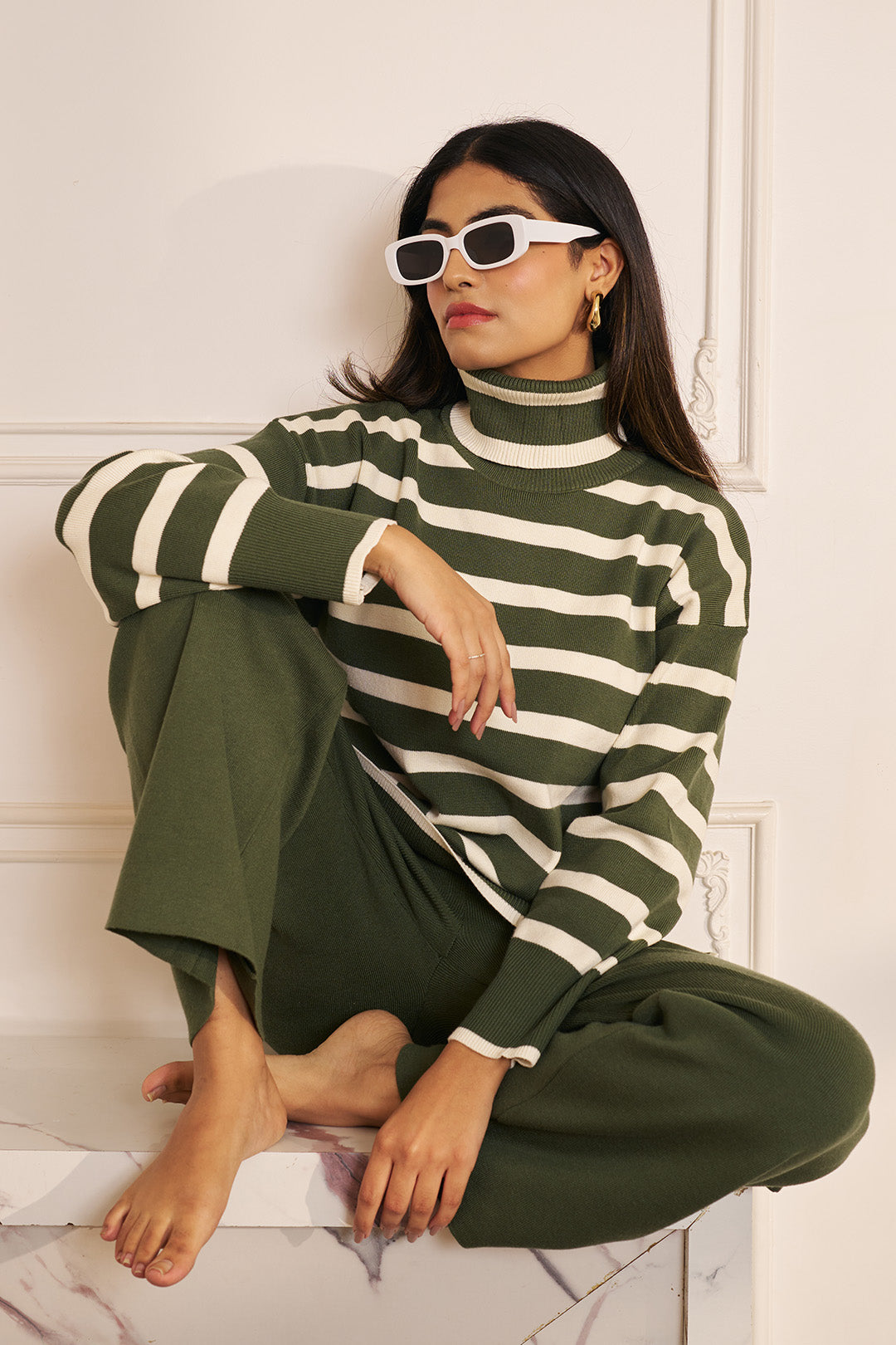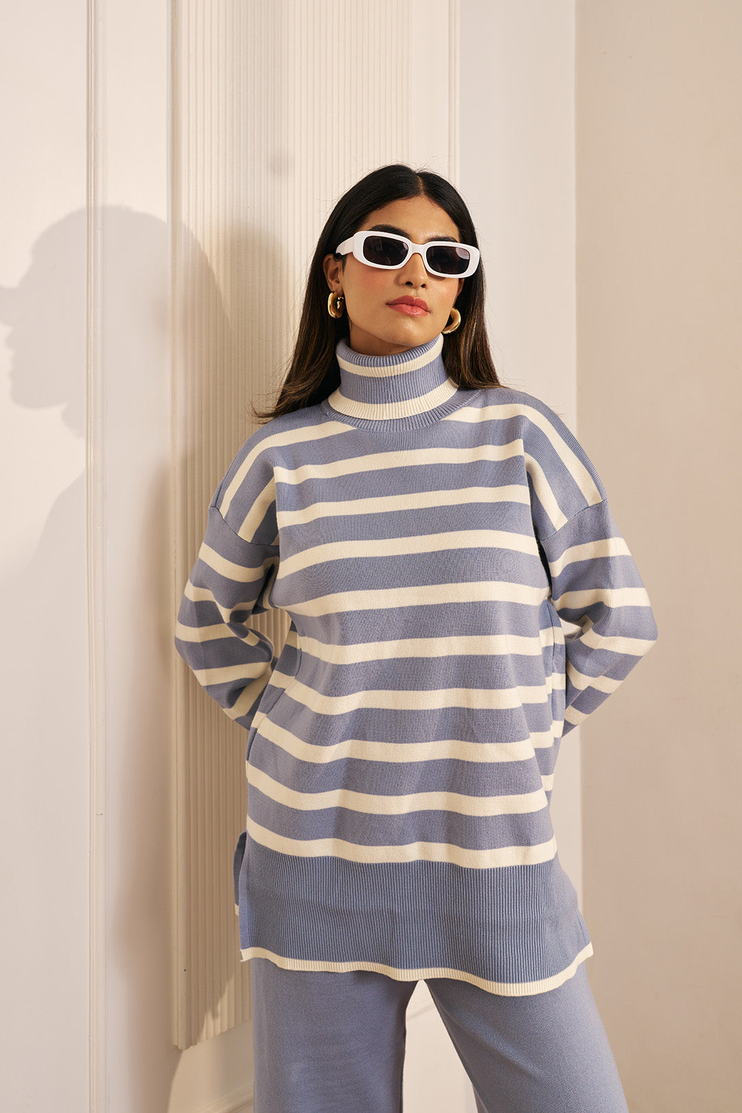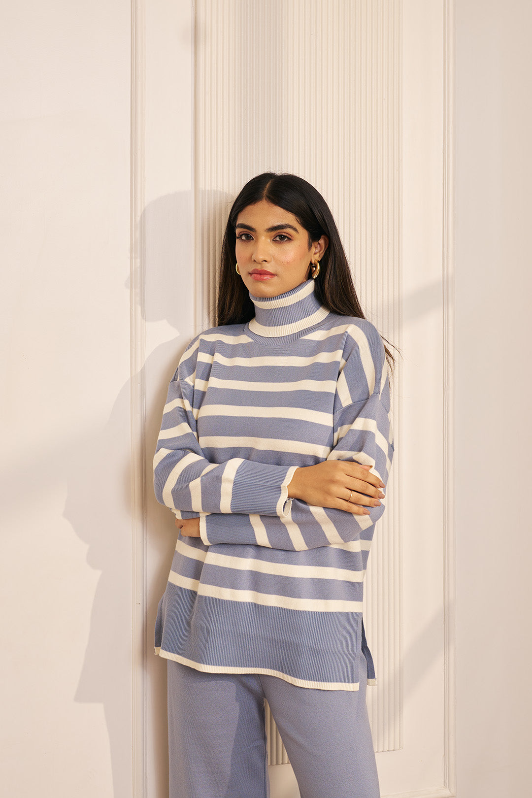 Women Blue and White Striped Turtle Neck Knit Co-ord Set Kourtney Olive